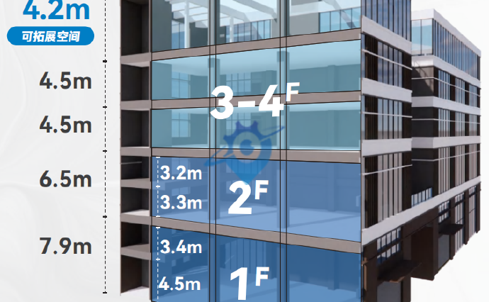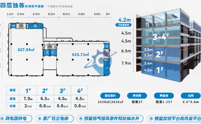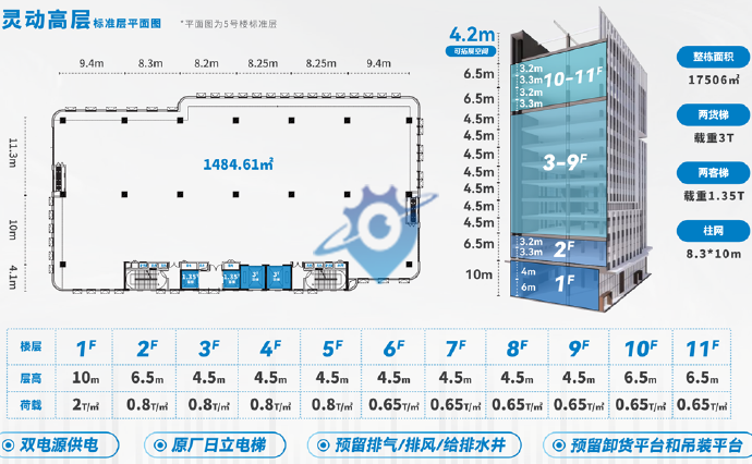 园区产品:一期面积约4.8万㎡,建设6栋4层独栋厂房,约2600㎡/栋;4栋6层独栋厂房,约3500㎡/栋;1栋11层高层厂房,约1400㎡/套