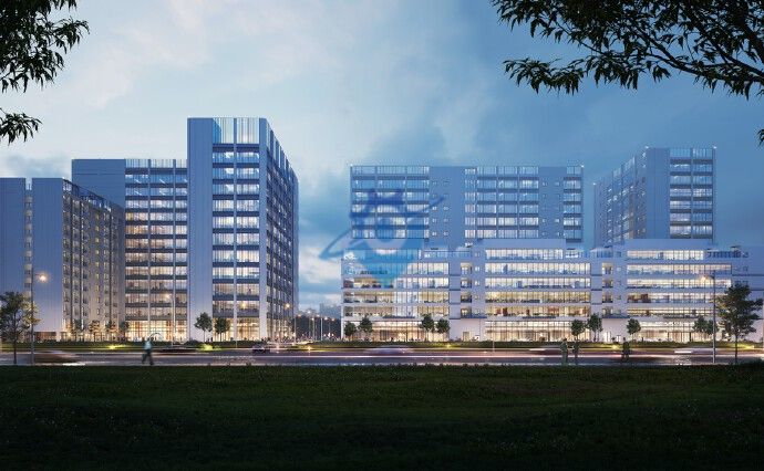 项目占地41亩,总建面约10.6万㎡集总部办公、展厅、研发、轻生产于一体